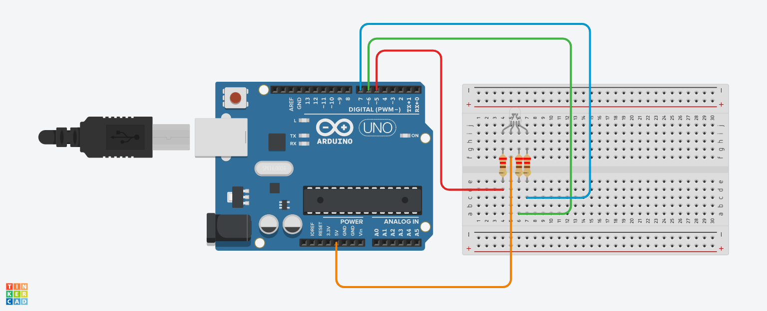 Ortak Anot RGB LED’in diğerlerine göre biraz uzun olan ucu ortak uçtur. Bu artıya bağlanır. LED’lerin diğer uçları ise direnç ile beraber Arduino’nun dijital uçlarına bağlanır. LED’lere +5V hepsine ortak gelmektedir. Dijital çıkış LOW (yani eksi) yapıldığında LED yanacaktır.