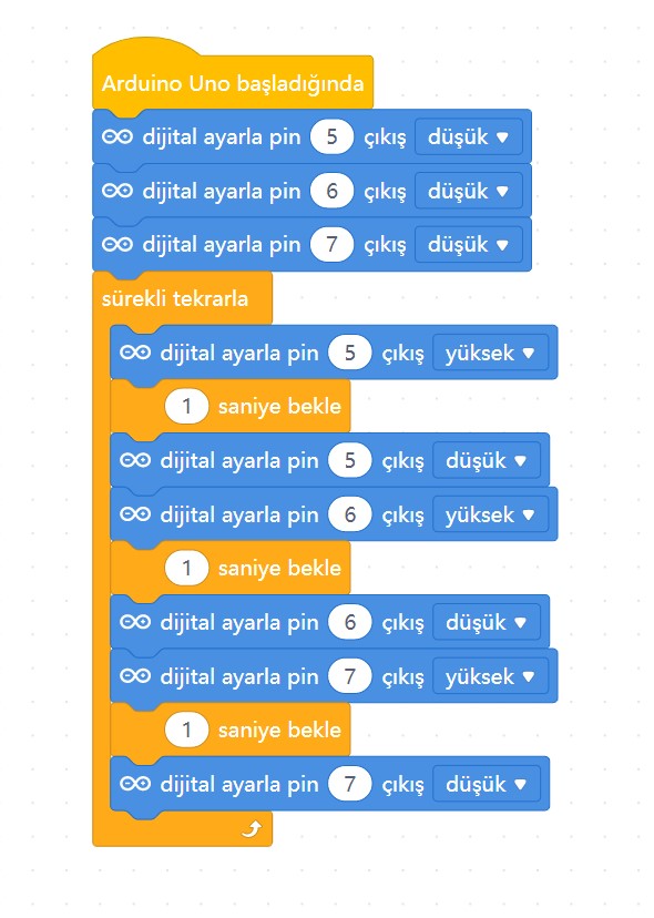Burada ortak olan uç GND’ye yani eksiye bağlanmıştır. Bu durumda LED’lerin yanması için dijital pin HIGH yapılmalıdır.