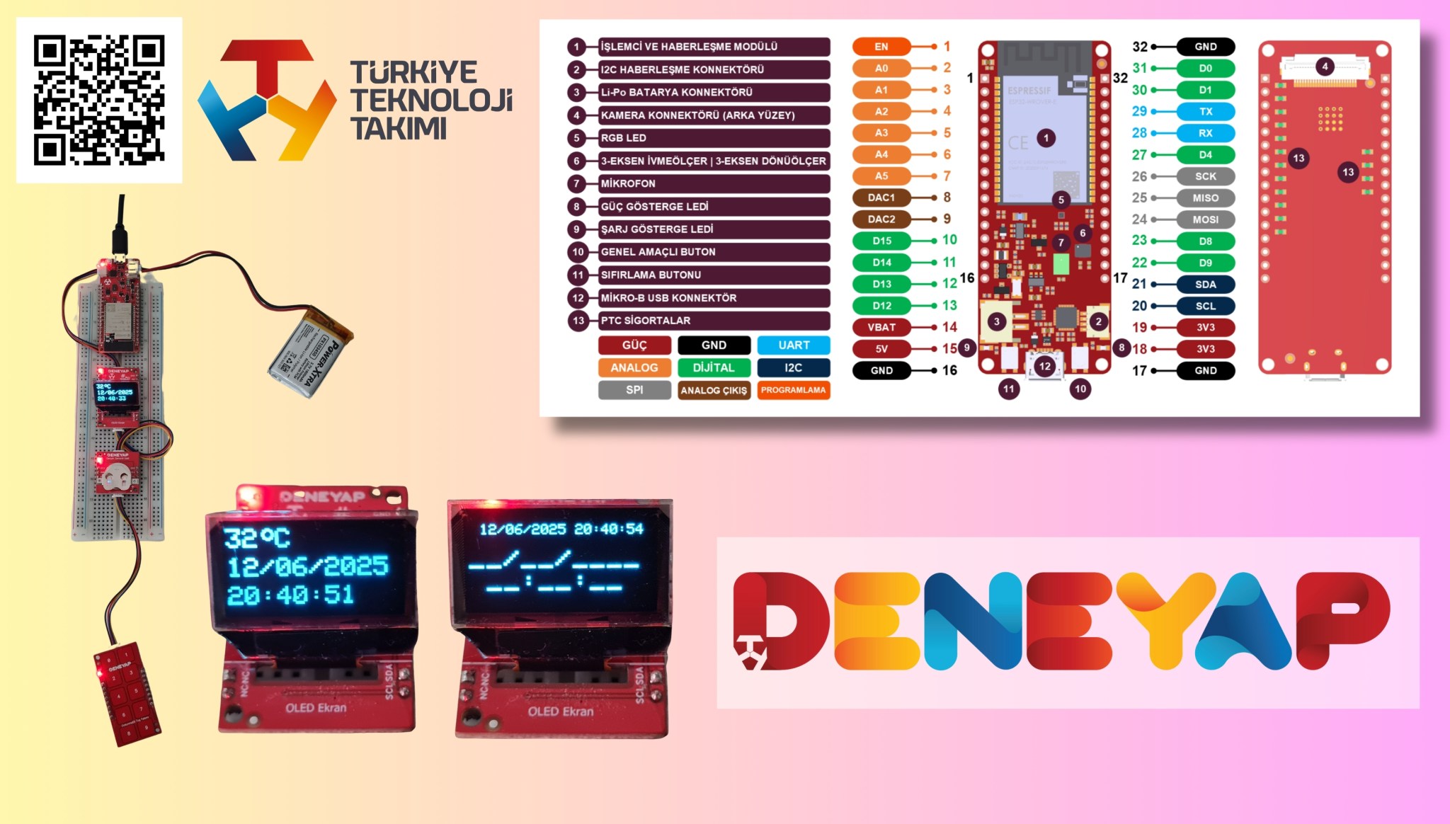 Bu masa saati uygulamamızda OLED ekranı Adafruit kütüphanesi ile kullandık. Bu kütüphane ile bir çok çizimi yapabiliyoruz ve yazı büyüklüğünü ayarlayabiliyoruz. Deneyap sıcaklık ve nem modülünü kullanmadık. Kendi IMU sıcaklık modülü ile sıcaklığı ölçüp ekrana yazdırdık.